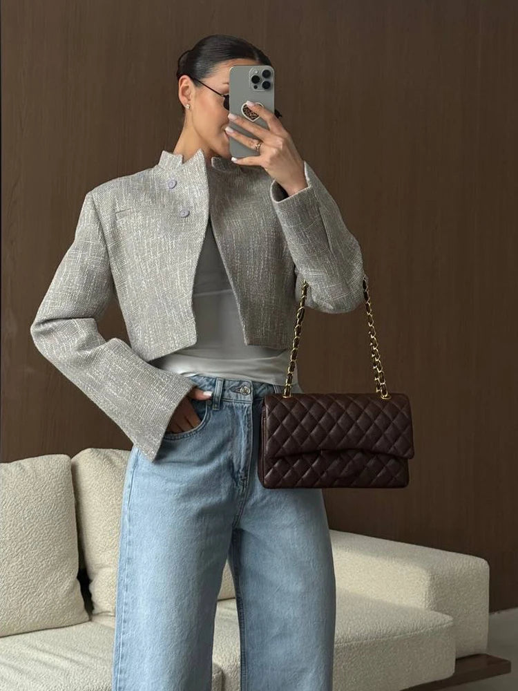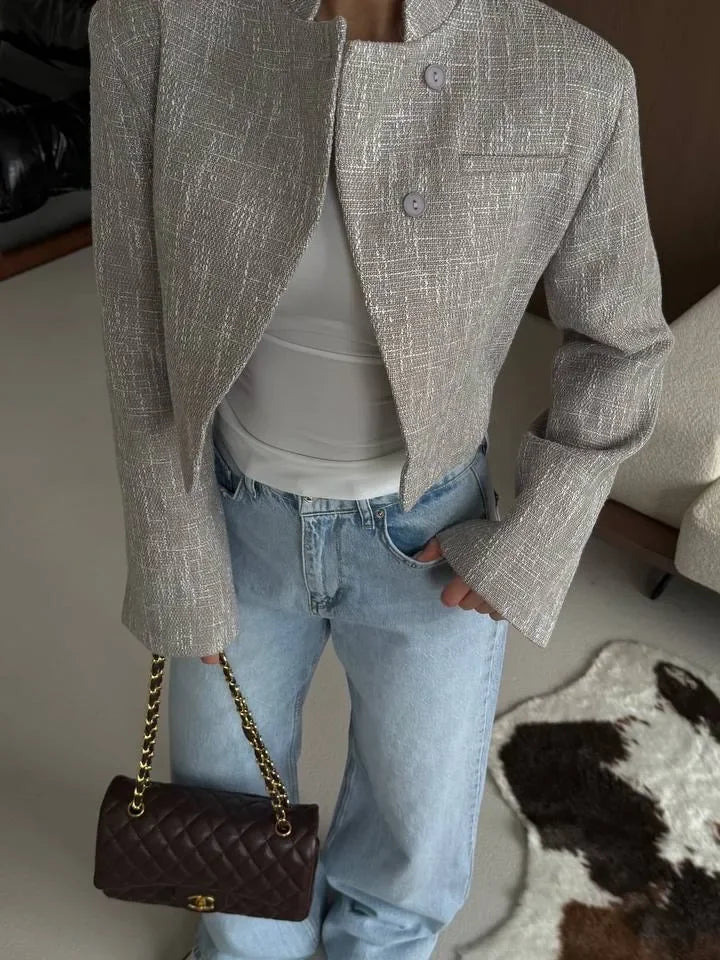 This is the blazer that transforms your entire wardrobe. With its sleek cropped cut and structured stand collar, you'll look effortlessly put-together whether you're crushing a morning meeting or grabbing drinks after work.